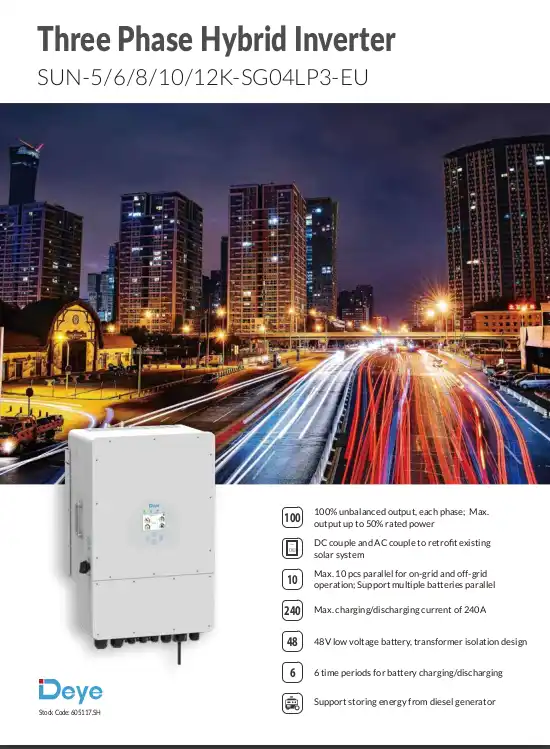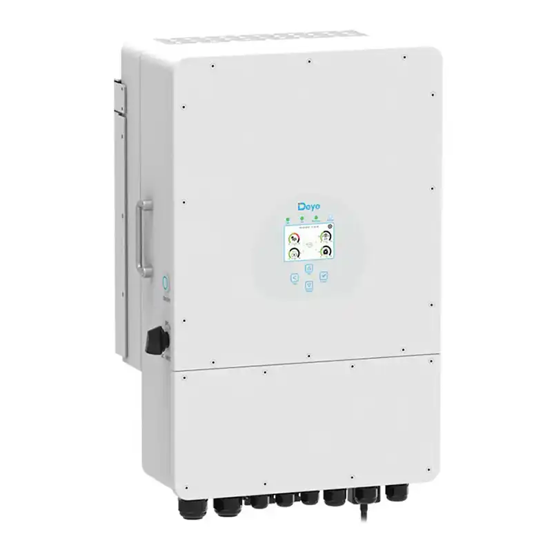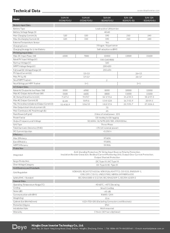 Multifunkční 3fázový asymetrický (150%) hybridní měnič/střídač od výrobce DEYE, který kombinuje funkce měniče, solární nabíječky a nabíječky baterií. Nabízí nepřerušovanou podporu napájení s možnostíregulace. Komplexní LCD displej zajišťuje uživatelsky konfigurovatelné a snadno dostupné ovládání (nabíjení baterie, AC/solární nabíjení, přípustné vstupní napětí v závislosti na různých aplikacích atd.). Je vybaven portem RS-485/CAN pro komunikaci a správu. Měnič poskytuje další informace, statistiky, grafy + možnost dálkové správy přes dodávaný Wi-Fi dongle. Součátí balení jsou sondy pro měřeníspotřeby i datalogger. Elektroměr součástí není.